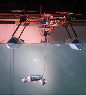 At Aerial robotics laboratory, Imperial College London, we have designed, a Multi-Environment Dual-Robot for Underwater Sample Acquisition (MEDUSA)1. This is a novel robotic water sampling platform that combines the technologies of multirotors and underwater micro-vehicles. The platform is capable of flying, landing on the water surface and a tethered mobile underwater pod released from the system can collect water samples to depths of several meters underwater. The platform can perform the challenging task of aquatic sampling that otherwise require lengthy motorboat operations or autonomous underwater vehicles. We hope to deploy this system as a cost effective and safe solution with applications in the marine industry, as well as in environmental and infrastructure monitoring.