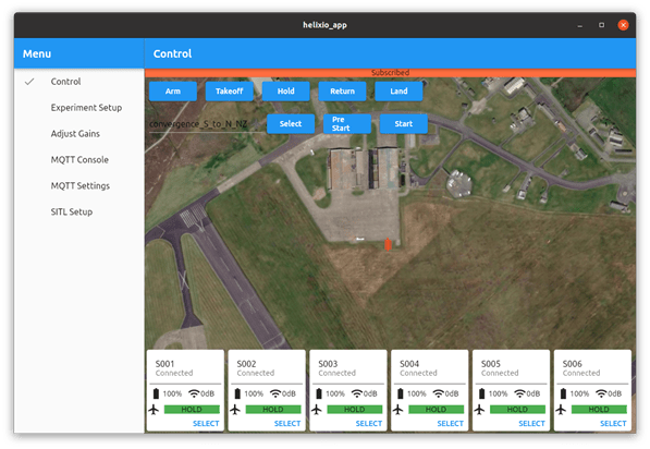 The Helix Framework ground control app allows users to command the swarm of UAVs, start and stop experiments and monitor them in real time. The app is built with Flutter, a multi platform development framework that enables a single codebase to be used for iOS, Android, Linux and Windows.